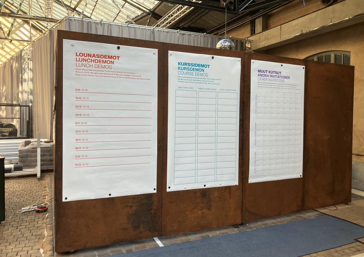 Idén att använda Torgs scenen för lunchdemonstrationer och att sätta upp en anslagstavla för att marknadsföra demonstrationer kom upp på Teaterhögskolans Community Day för studenter och personal i september.